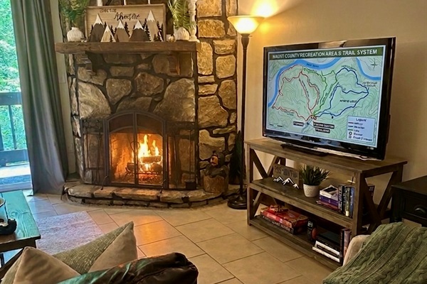 Snuggle up on the large couch and enjoy the woodburning fireplace while streaming your favorite shows on the ROKU enabled TV.